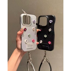 银底皮纹标签立体宝石链条适用iPhone16promax苹果15手机壳17新款