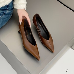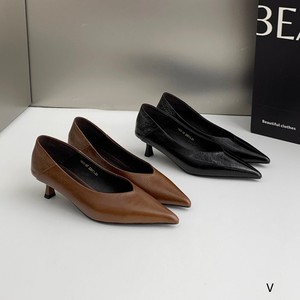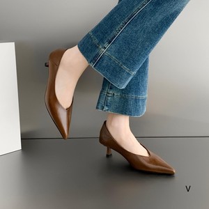 欧洲站女鞋25秋冬时尚踩跟软油蜡牛皮尖头V浅口小猫低跟工作单鞋