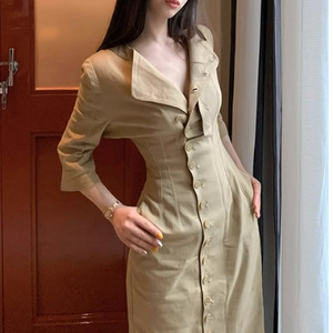 2025秋季新款气质时髦通勤单排扣收腰显瘦翻领长款连衣裙女长裙子