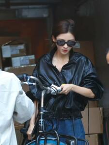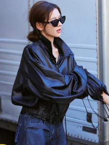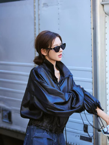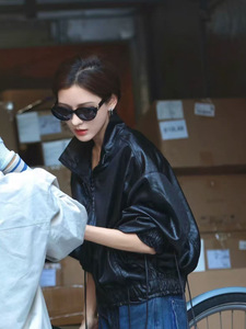 张予曦同款皮衣黑色纹理短外套女秋冬新款设计感复古立领抽绳夹克