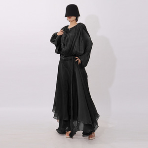 欧美气质纯色收腰长裙2025秋季新款系带长袖不规则高级感连衣裙女