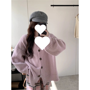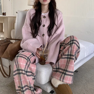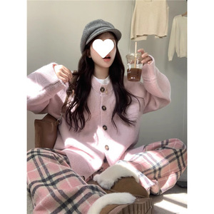 韩剧穿搭套装秋冬温柔气质慵懒风毛衣开衫格子裤阔腿长裤两件套女