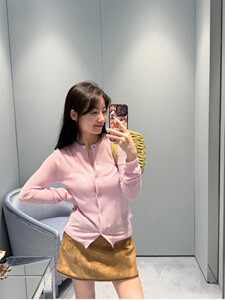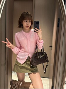 深圳南油女装 粉色天丝棉镂空单排扣圆领针织开衫上衣修身显瘦