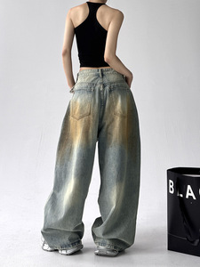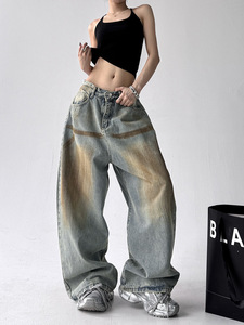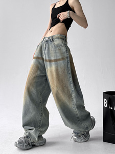 水洗做旧牛仔裤男直筒宽松阔腿美式高街裤子潮牌痞帅脏染铁锈长裤