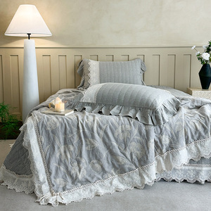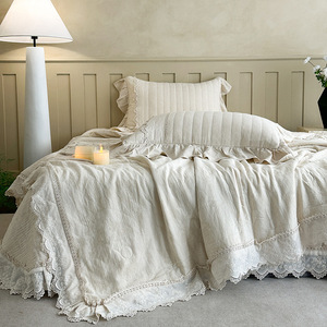法式简约风蕾丝花边棉麻床盖三件套多功能印花春秋被保暖双人床品