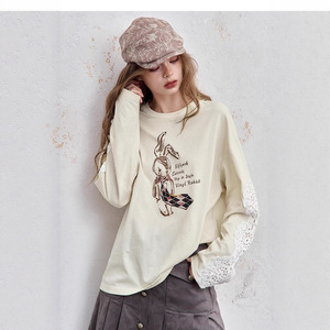 妖精的 「蕾丝日记」蕾丝拼接印花长袖t恤女设计感休闲上衣