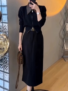 欧货小众拼皮双拉链翻领针织外套女秋冬时尚洋气短款软糯毛衣开衫