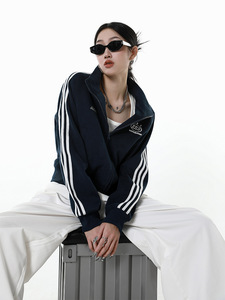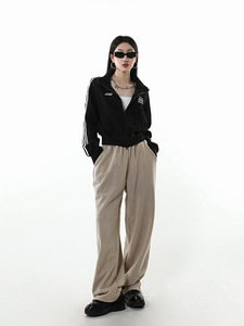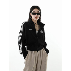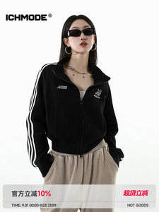 ICH MODE 美式复古短款黑色外套女春秋2025新款运动卫衣开衫