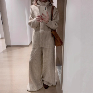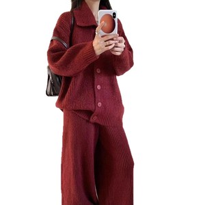 欧美跨境大码翻领毛衣套装女宽松慵懒风休闲针织开衫阔腿裤两件套