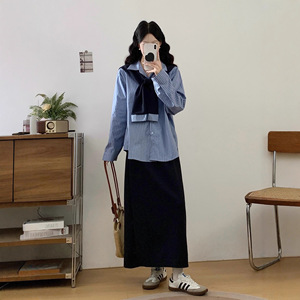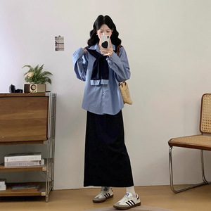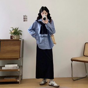 大码秋季复古韩系休闲蓝色条纹衬衫+披肩+半身裙三件套