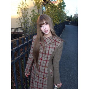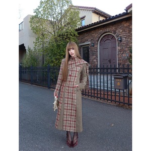 韩版气质高级感复古格纹拼接大衣冬季新款加厚保暖长款毛呢外套女