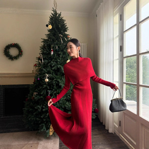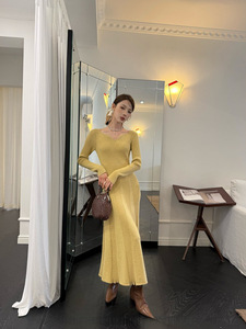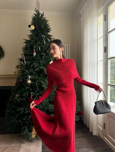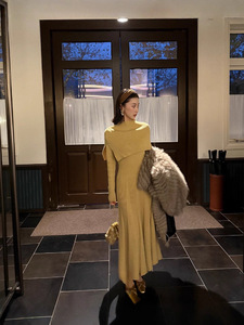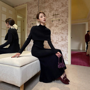 南油原创设计高端女装复古鱼尾连衣裙春秋披肩两穿坑条针织打底裙