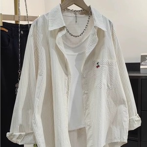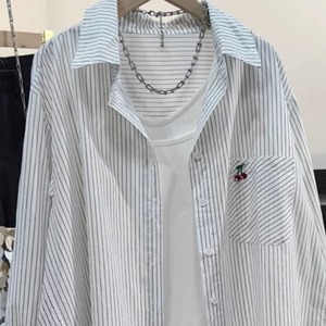 竖条纹樱桃刺绣纯棉衬衫女秋季新款防晒外套休闲宽松百搭开衫上衣