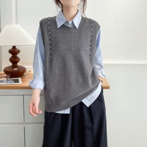 早秋新款200斤胖妹妹气质钉珠针织马甲大码女装通勤圆领坎肩8105