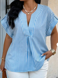 2025亚马逊跨境欧美新款条纹印花V领休闲时尚T恤衬衫