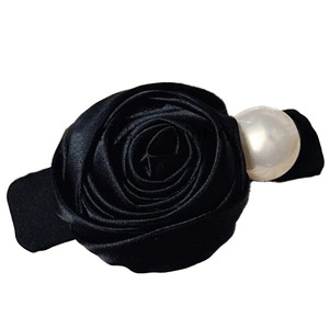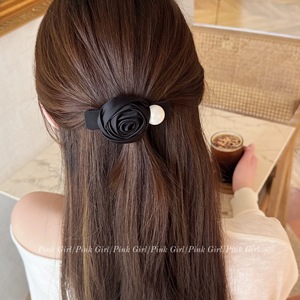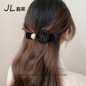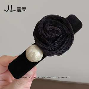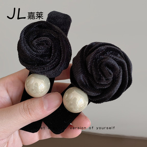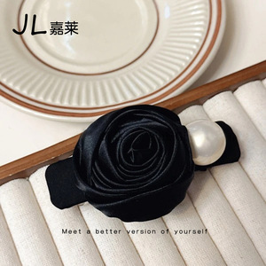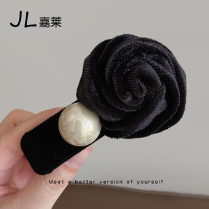 秋冬新款优雅丝绒百搭黑色玫瑰花8cm弹簧夹发夹女后脑勺半扎发夹