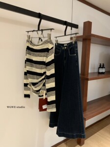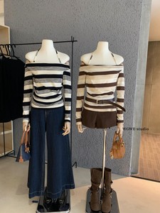 WGWE秋季韩系简约风条纹百搭显瘦挂脖绑带一字领长袖T恤女W7048