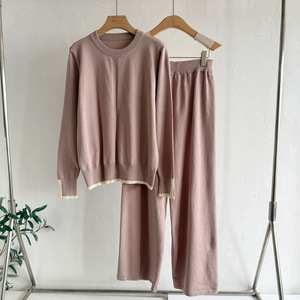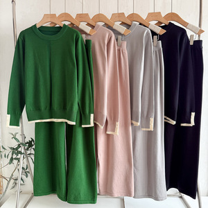 简约时尚欧美拼接两件套圆领弹力针织毛衣高腰宽松阔腿裤套装女装