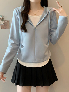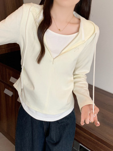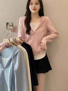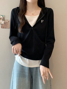 2025年秋装新款胖mm大码女时尚减龄假两件抽绳连帽长袖上衣