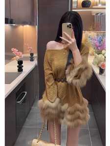 法式咖色毛绒袖口连衣裙搭配腰带两件套女秋冬季名媛气质纯欲套装