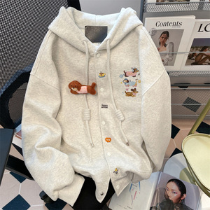 开春设计感纽扣连帽卫衣开衫女小个子chic韩系腊肠狗刺绣上衣外套