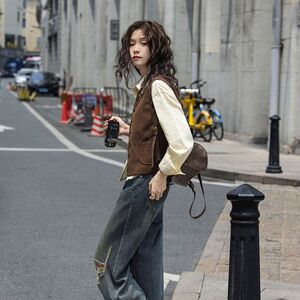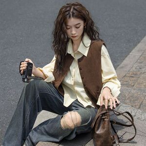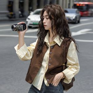 韩版圆领马甲女2025春秋装新款百搭无袖外套咖啡色复古文艺马夹上