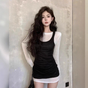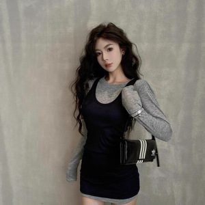 休闲正肩长袖T恤女秋季新款打底衫收腰修身显瘦纯色背心辣妹套装