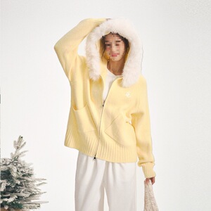 跨境饼饼iNSLiiSA软糯慵懒风温柔连帽毛领针织衫女休闲百搭毛衣米