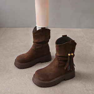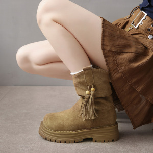 2025新款秋冬季流苏时装靴子粗跟复古英伦骑士靴学院风厚底马丁靴