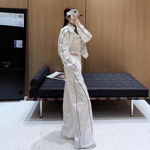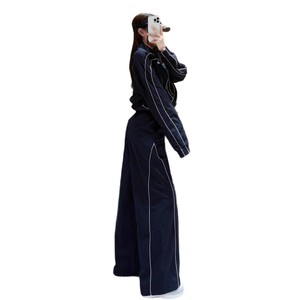 ALO早秋新款韩版时尚运动撞线百搭显瘦长袖高腰阔腿裤时尚套装女