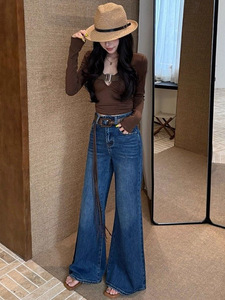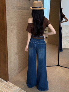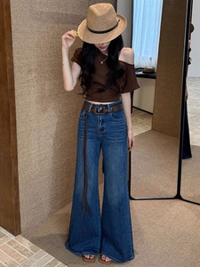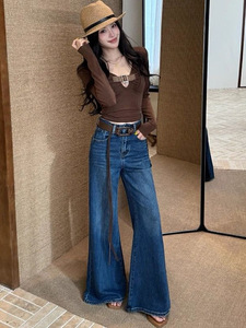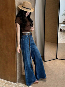 复古不贴腿直筒微喇牛仔裤女高腰新款微弹宽松显瘦百搭拖地喇叭裤