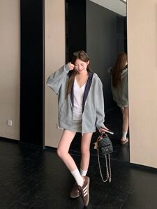 美式复古撞色连帽拉链卫衣外套女秋季休闲宽松开衫慵懒风灰色上衣