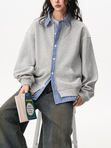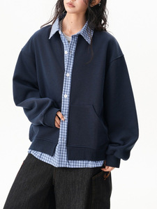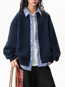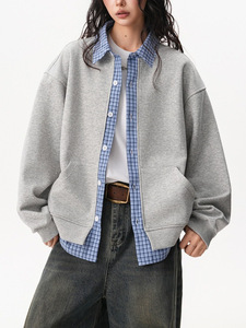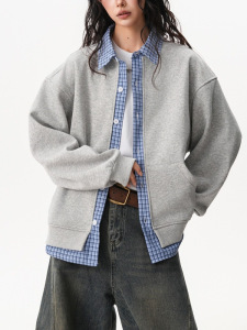 美式学院风格纹拼接假两件开衫女男秋季宽松慵懒情侣Polo卫衣外套