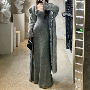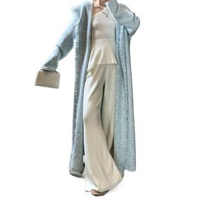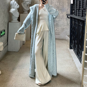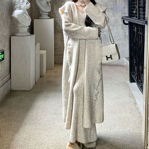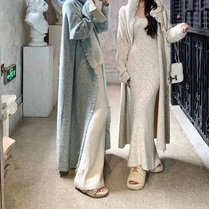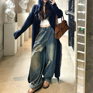 秋冬新款韩版中长款连帽针织开衫女宽松慵懒风休闲过膝流苏边外套