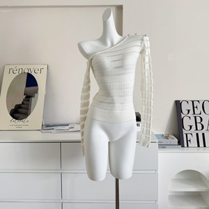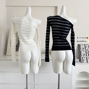 2025实拍显胸打底 纯欲纱纱拼接针织斜肩上衣打底针织衫
