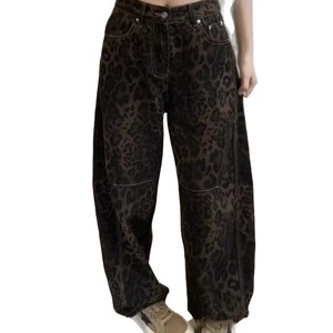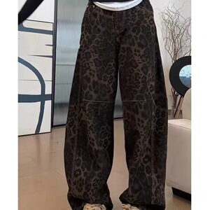 大码美式豹纹直筒牛仔裤女2025春秋胖mm宽松显瘦高腰阔腿弯刀裤子