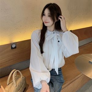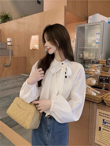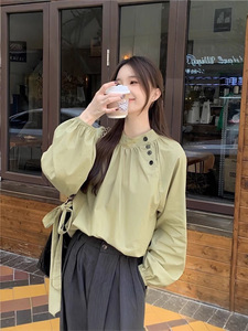 2025秋季新款法式立领气质斜扣宽松长袖衬衫系带蝴蝶结百搭上衣