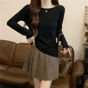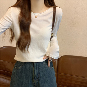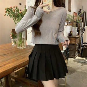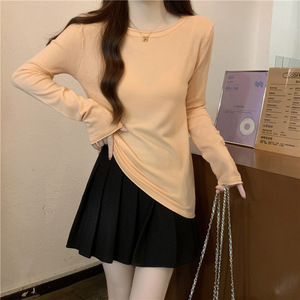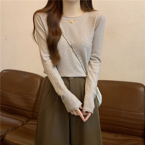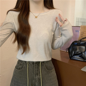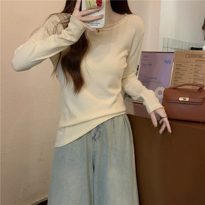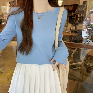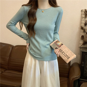春秋薄款圆领百搭修身显瘦长袖打底针织衫上衣秋冬内搭粉色毛衣女