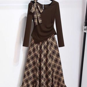 不规则斜肩长袖上衣雪纺格纹半身裙女套装薄款2025早秋新款连衣裙