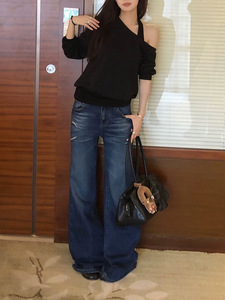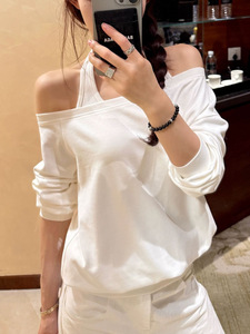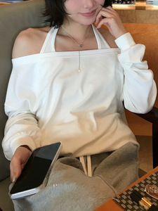 SUNONEOE 天丝挂脖宽松慵懒斜肩卫衣女秋季新款美式长袖套头上衣