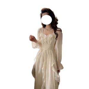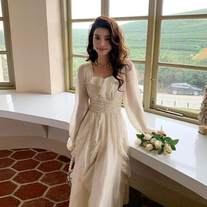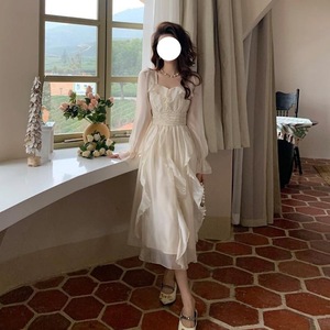 2025早秋小香风设计感杏白色裙子超仙森系甜美收腰显瘦长袖连衣裙