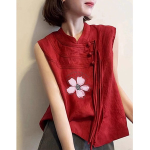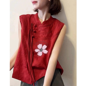 新中式国风巨好看设计感上衣红色圆领盘扣无袖印花马甲女2025秋季