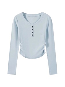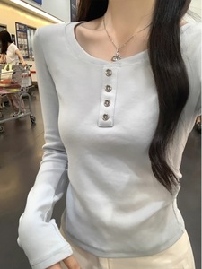 马卡龙蓝色韩版秋冬季新款百搭别致小众女褶皱收腰德绒长袖打底衫