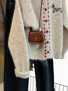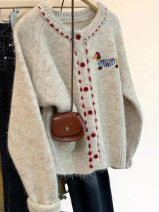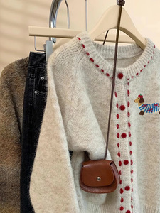 杏色小狗加厚圆领针织开衫女秋季2025新款设计感外穿软糯毛衣外套
