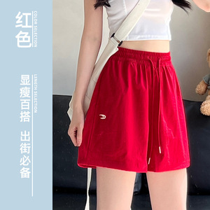 蓝色刺绣工装裤女夏季2025新款高腰宽松a字美式速干运动五分短裤
