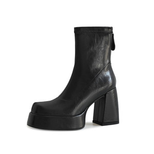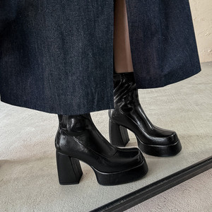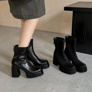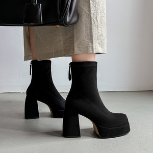 超高跟瘦瘦靴女弹力短靴子秋新款绒面皮革圆头后拉链粗跟水台短靴