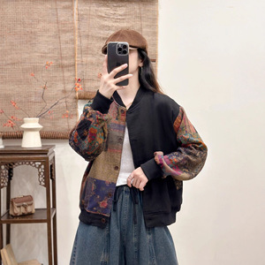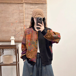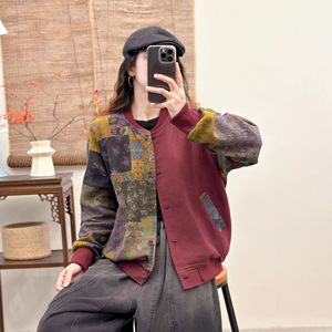2025秋季新款 复古拼贴花卉贴布斜纹双纱外套 宽松圆领开衫外套女