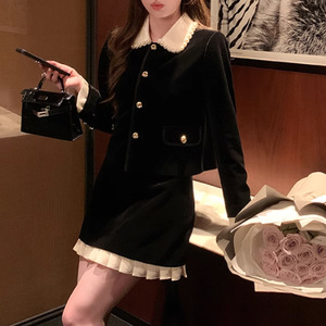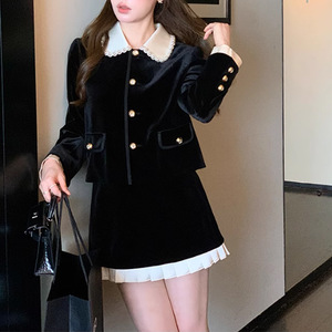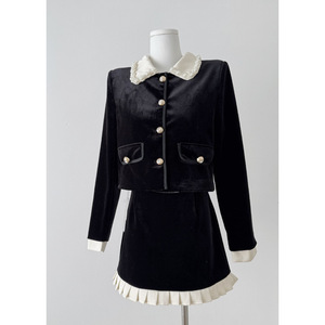 2025秋季miu系富家千金风黑色丝绒套装两件套 珍珠娃娃领上衣外套