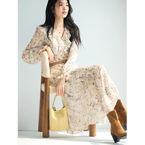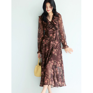 显瘦版型V领荷叶边前开叉设计百搭连衣裙2025秋装新款1G8993921