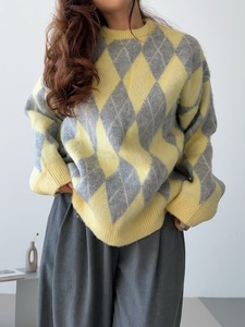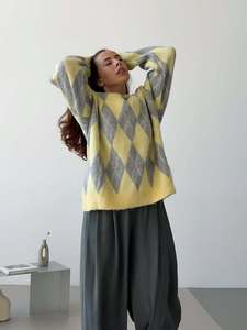 北欧经典菱格纹潮流圆领套头毛衣 秋冬季保暖设计感长袖针织衫女